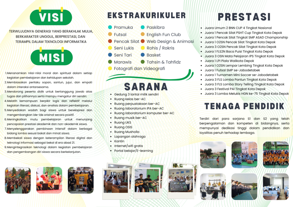 Kami bangga menjadi sekolah yang terus berkembang dan berkomitmen mencetak Generasi yang BERAKHLAK MULIA, BERKARAKTER UNGGUL, BERPRESTASI, dan TERAMPIL DALAM TEKNOLOGI INFORMATIKA.